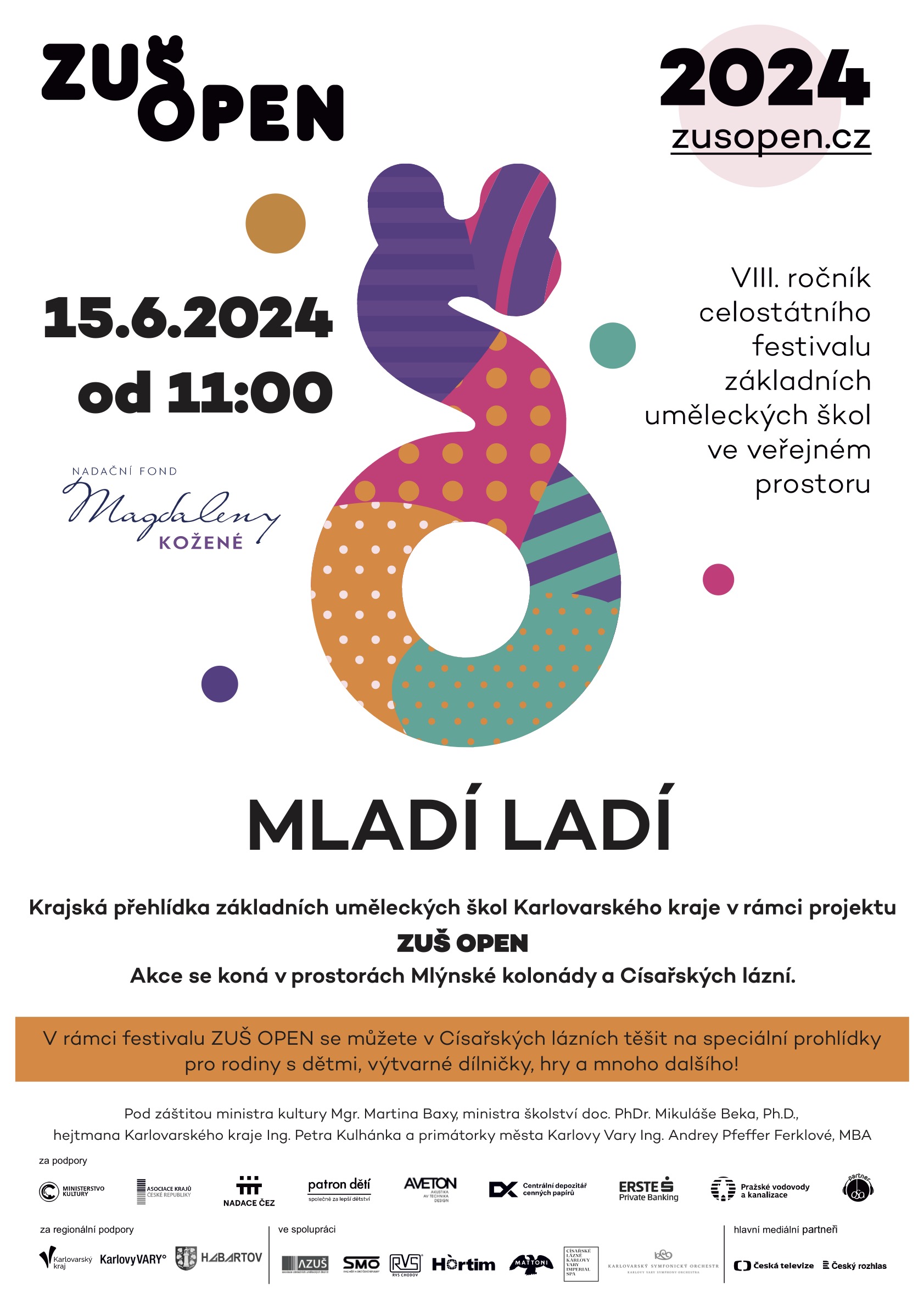 - 11., 26. 11. a 27. 11. 2024 se koná jako již tradičně jednou za dva roky Festival tvorby ZUŠ Karlovarského kraje v Městském divadle v Karlových Varech. Pořadatelem je Krajská umělecká rada Karlovarského kraje, jejíž vedoucí je PhDr. Ilona Juhásová – učitelka hry na klavír v naší ZUŠ. I tentokrát se pokusíme vypravit autobusy na jednotlivé večery a doufáme, že je naplníme ze strany žáků ZUŠ i ze strany Akademie pro seniory.